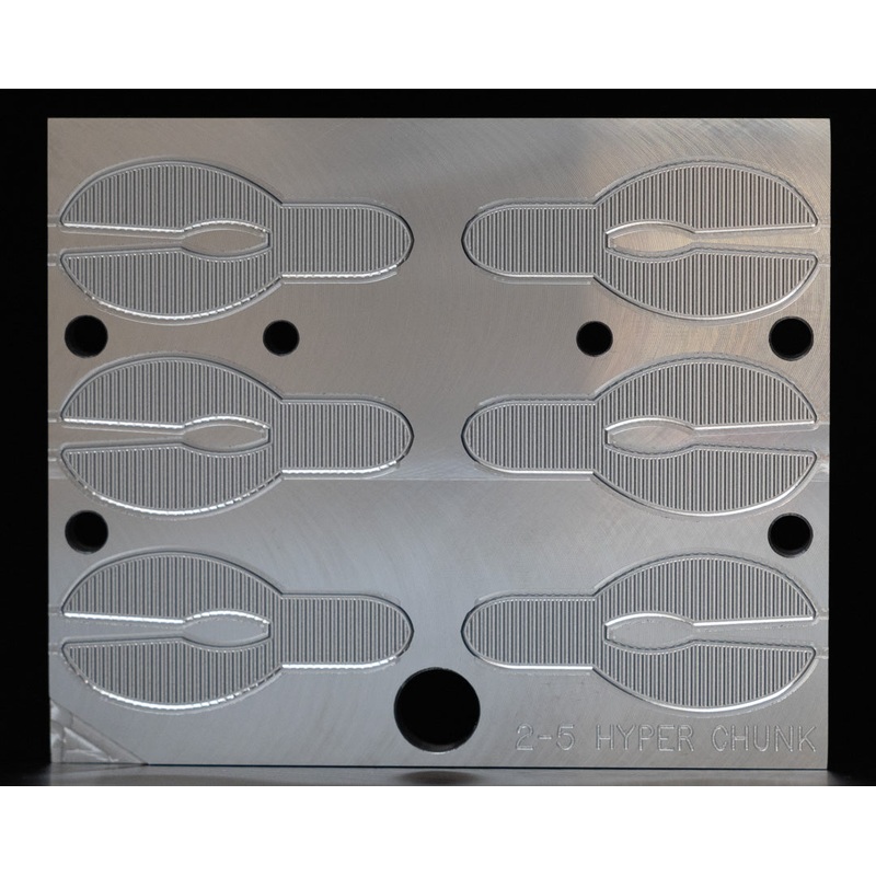 Angling Ai Hyper Chunk MoldCreate your jig chunk trailer and make your favorite colors to match your favorite jig skirts.Chunk Size: 2.5" long with 1/16th" thick claws.Body Size: 3/8" thick and 03/4" long 1/2" wide.Flat Injection Style Mold6-Cavity