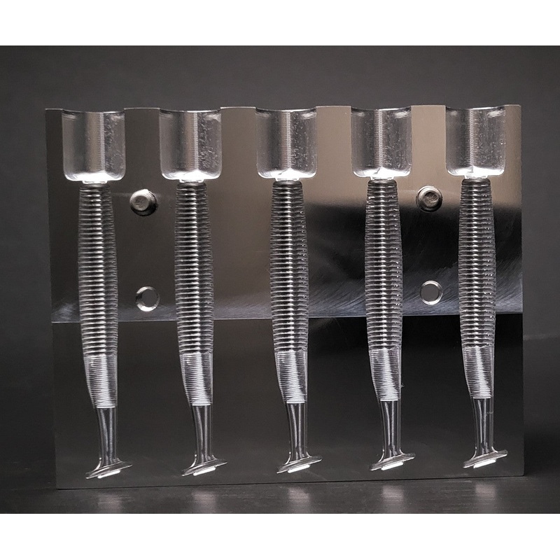 Maximize the effectiveness of your Ned Rig by incorporating the “Minnow Like” Tail action from our 3.25″ NED Swimmer Mold. With 5-cavities and a .400″ diameter body, this mold allows for a tight tail action that accurately mimics fish feeding on the bottom. Additionally, the top injection design makes it possible to create dual-colored baits using a dual injector setup.