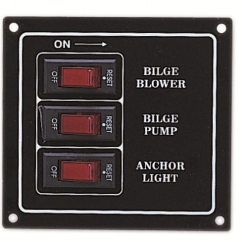 Switch Panel Specification: Material: Aluminum Plate, Black Voltage: 12 VDC 20 Preprinted Labels Included UL Approved Illuminated Switches w/Patented Circuit Breakers- 5A x 1, 10A x 1, 15A x 1 Splashproof Blister PackLength - 101.6mmHeight - 95.3mmThicknes