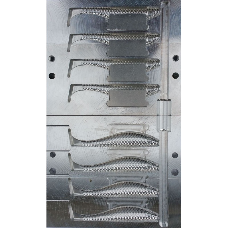 4" DR Swim Bait Mold- Creates single color baits only.2 piece injection swim bait mold with hook slot and cup eye for inserting1/4"soft plastic eyes. Placing something "sticky" or "tacky" in the Eye pockets help ensure the pieces do not move. We have found