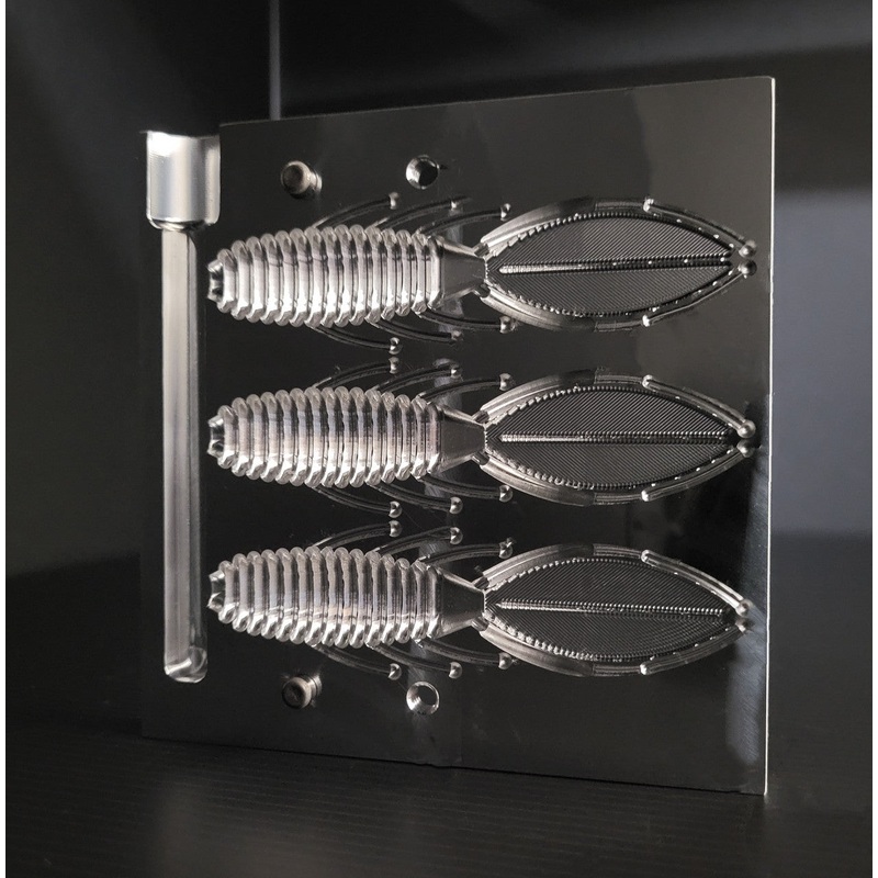 2 piece three cavity injection mold. Appendages are “tacked” together to make a versatile bait.
