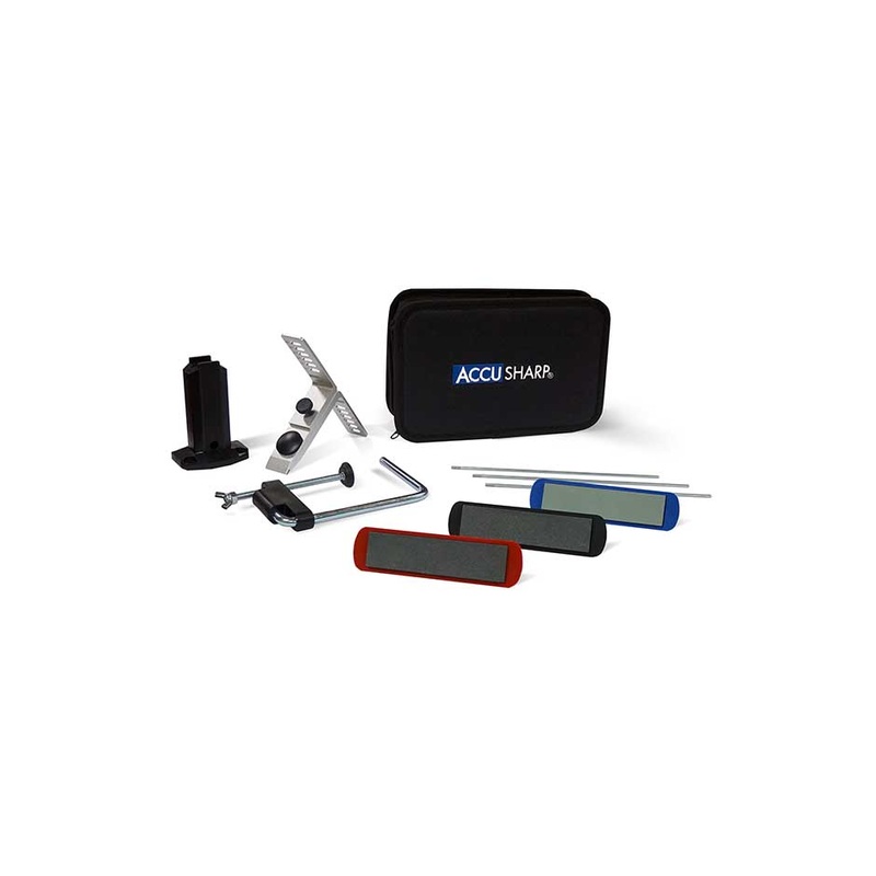 The AccuSharp3-Stone Kit is equipped with six angle guides and three sharpening options to keep your knifes edge razor sharp with fine, medium, and coarse alumina-oxide stones. Angle guide has settings for 11, 15, 18, 21, 25, and 30 angles.