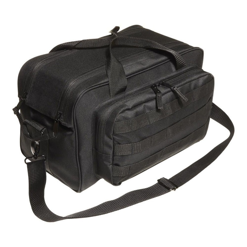 This classic black range bag has a 15-inch x 8-inch x 8.5-inch main compartment and a 12-inch x 6-inch x 1-inch exterior pocket as well as three rows of MOLLE loops. It comes with a padded pistol rug and a detachable shoulder strap.Product DetailsThis clas