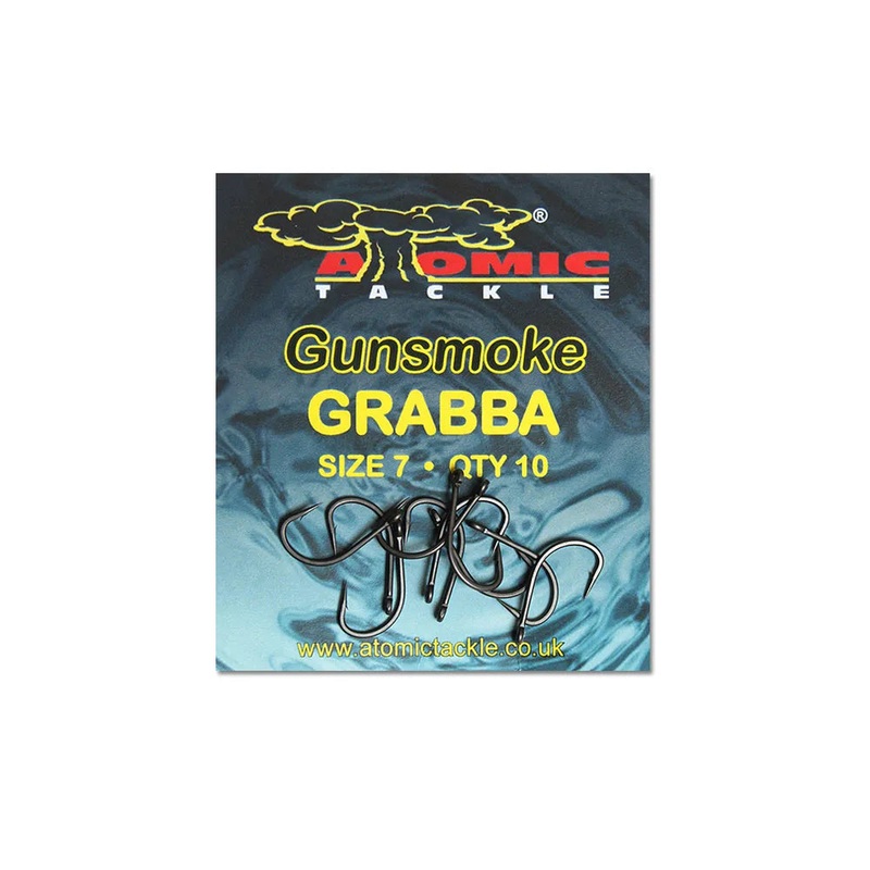 Key FeaturesUnique specialised matt electro-plated coatingSuper sharp hook pointCurved designWide gapeStraight pointUltimate strengthQty: 10 per packAtomic Tackle Grabba Hooks, Gunsmoke is a new coating that has been produced for Atomic Tackle, it is not T