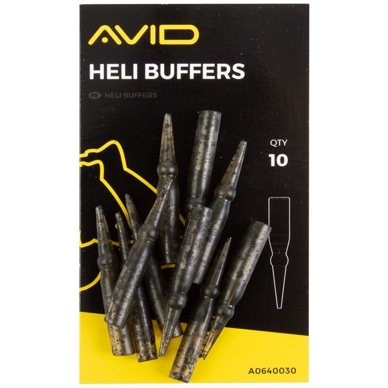 Avid Carp Heli BuffersThese act as a stopper between your rig and the lead, providing a nice, streamlined Helicopter Rig. There is a tapered section which allows for ring swivels so you can play carp during the fight.Quantity: 10 per packColour: Camo