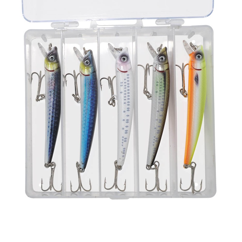 A floating lure with a diving vein, this lure will float on the surface when static and will dive just under the water when it is jerked or retrieved. A great calm water lure. Comes as a set of five lures in a box.
