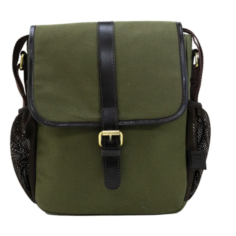 Leather trim and brass fittings, durable shoulder strap and two elastic pockets on the outside.