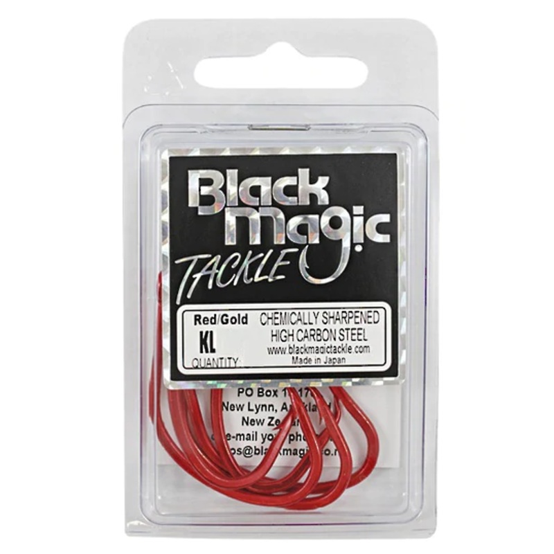 Black Magic KL Series Red Hook Economy Pack The Black Magic KL Series Red Hook Economy Pack integrates the attributes of a longline hook with a wide gape or kahle hook. Engineered for optimal performance, these hooks enable fish to self-hook with the drag