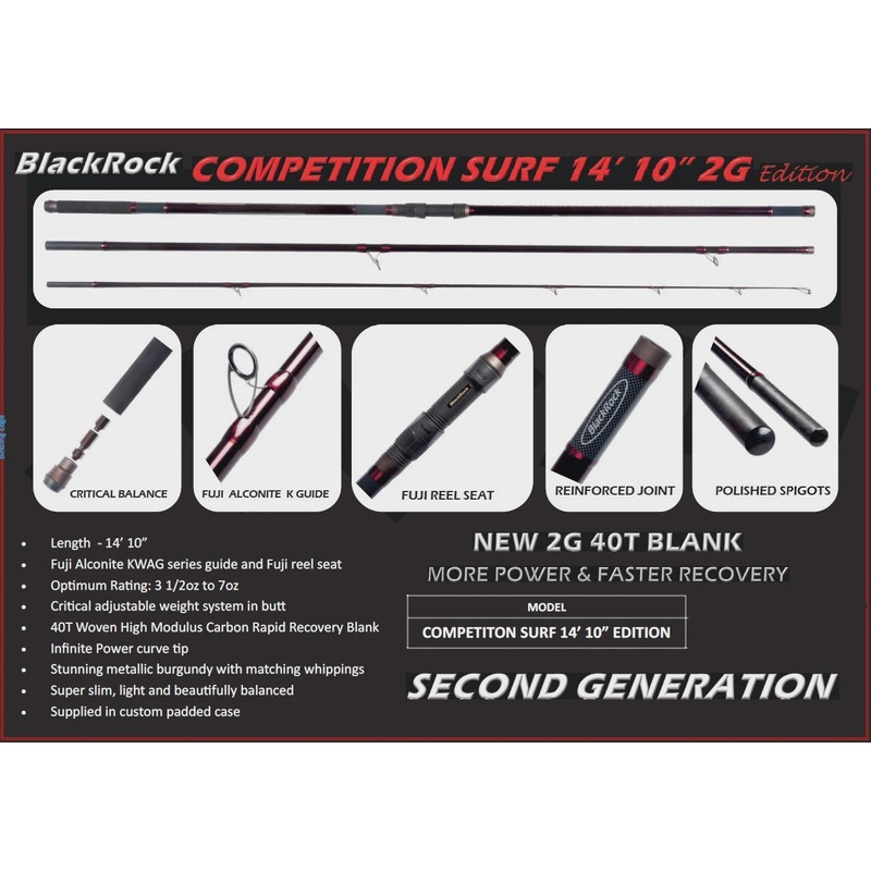 The Blackrock Competition Surf 14'10'' 2G edition rod is a 3 piece continental beach rod aimed at the sea match angler-High modulus 40t 2nd generation carbon blank slim light powerful-Length - 4.5m / 14' 10"-Powerfull action rated to 200g continental casti