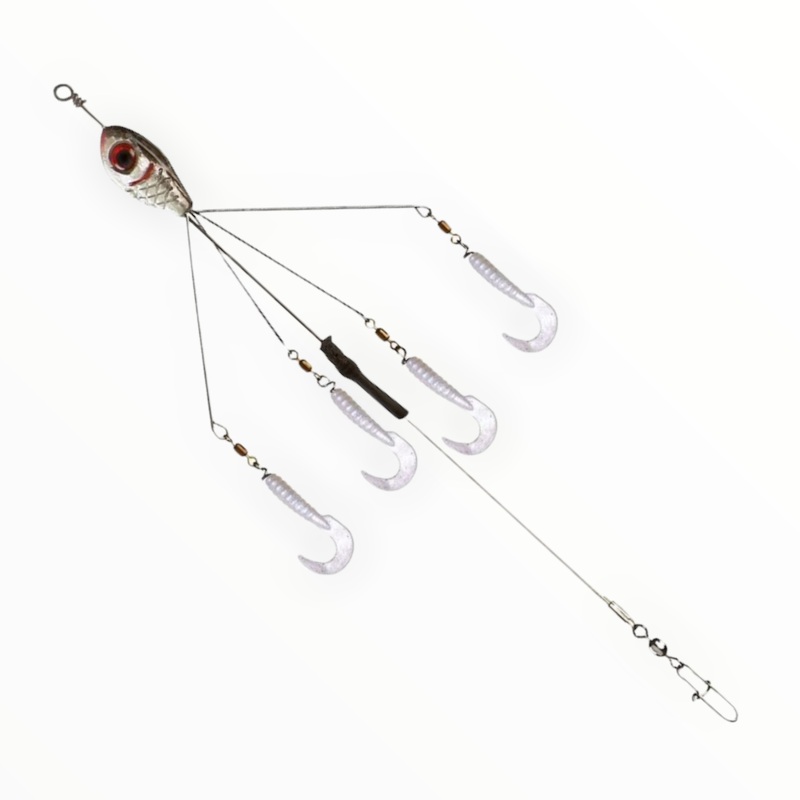 Booyah Boo Teaser Rig Series. Includes four lively, curly-tailed grubs held in place with screw-lock bait keepers to create an effective “bait chase” presentation. Features only one lure with hooks and is legal in all states.