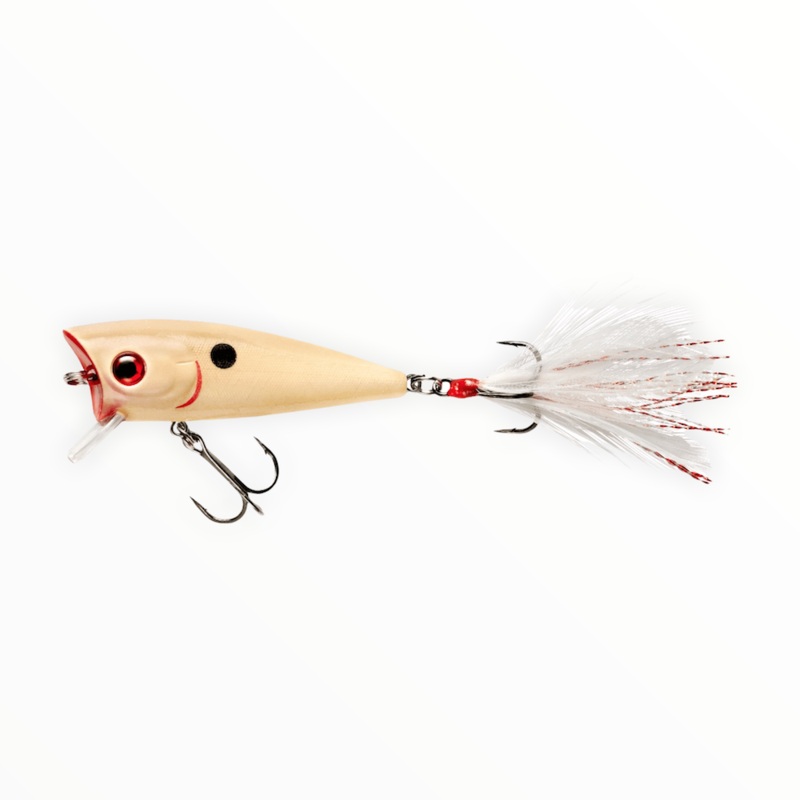 Youve never seen a lure like the BOOYAH Prank. A lipped popper, the Prank can be worked on top as a popper that spits water thanks to a cupped and shaved mouth. But it also doubles as a shallow-running crankbait where the shaved back helps impart a serious swimming action. A feather-dressed treble adds the final touch to entice strikes.
