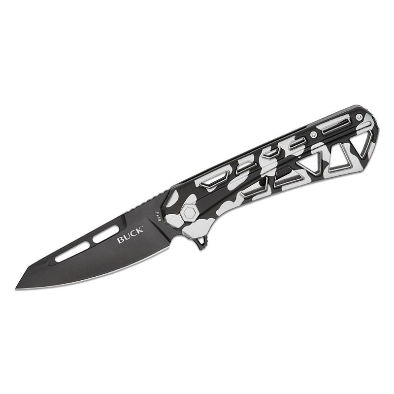Introducing the Buck 811 Trace Ops. This flipper knife packs a huge punch without breaking the bank. This model features a skeletonized black/white camo anodized aluminum handle and a 7Cr17 stainless steel reverse tanto blade, great for the vast majority o