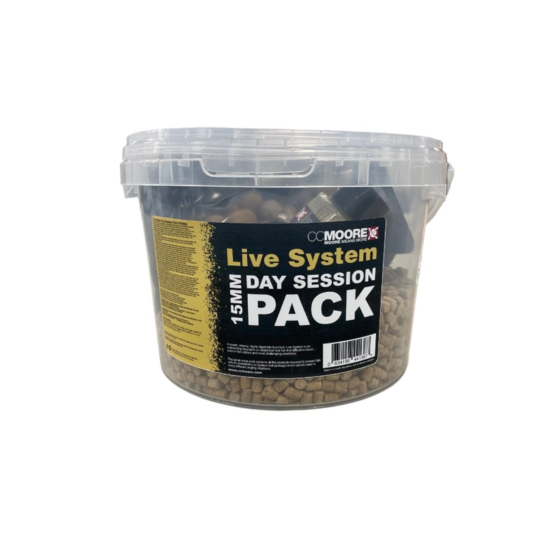 C C Moore Live System Day Session Pack 15mmPack Includes:--1/2 Kilo Live System 15mm Boilies-1/2 Kilo Live System Pellets 6mm-100ml Live System Bait Booster-10 Live system Airball Pop UpsAll in a Handy Bucket!