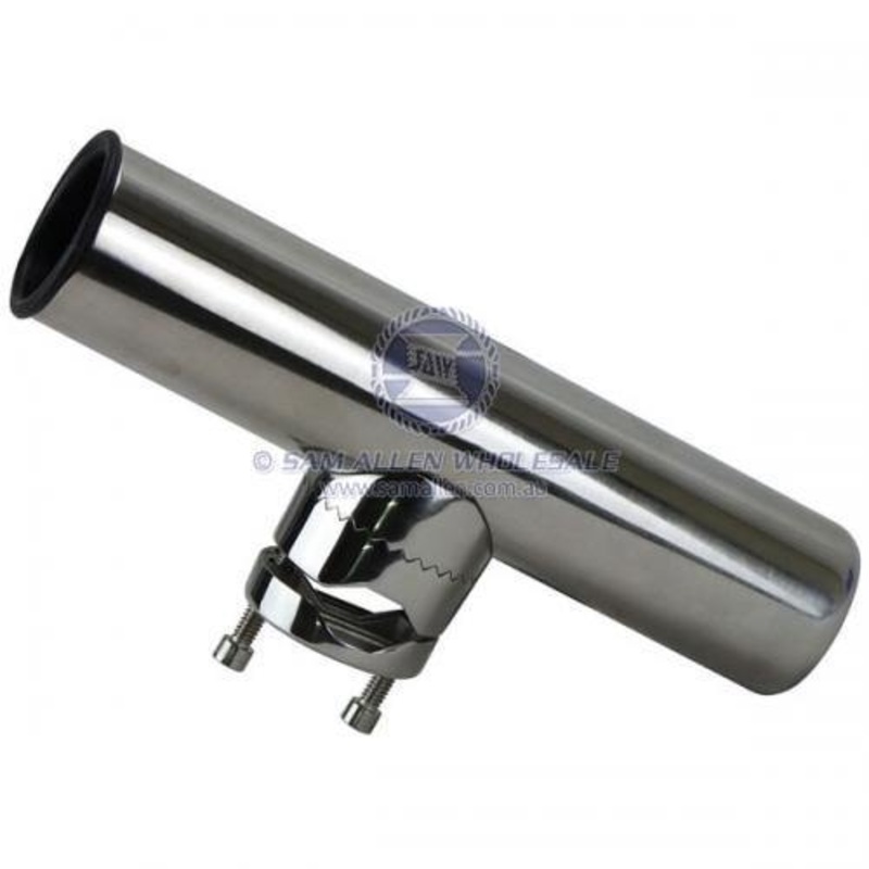 Clamp-On Rod Holder This clamp-on rod holder features a 316G polished stainless steel tube with a durable plastic liner and a closed bottom with drain holes to protect the rod. 360 rotation capability. Constructed with a 316G stainless steel clamp. Easily