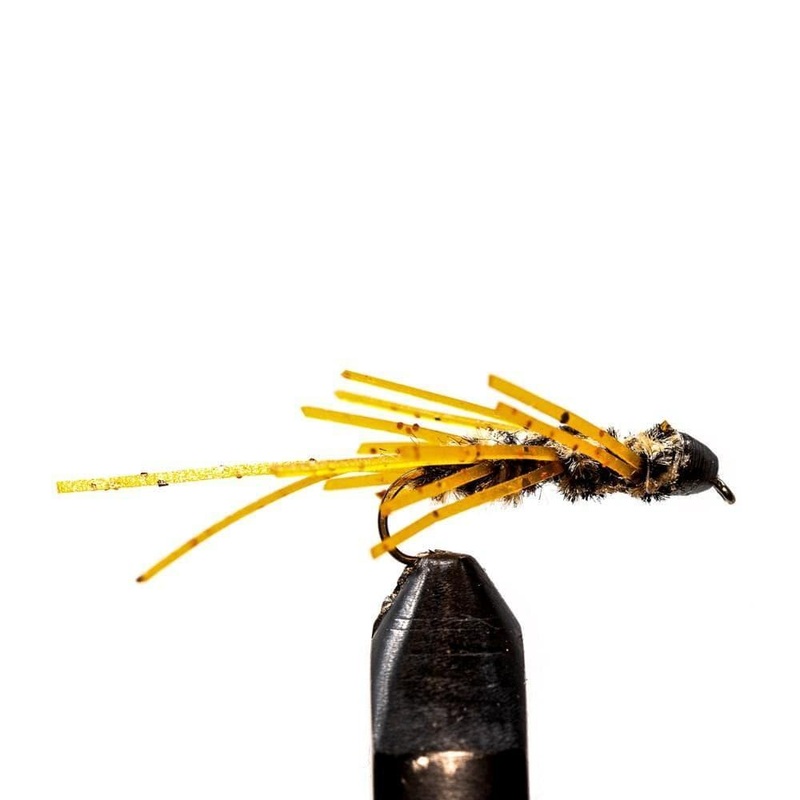 The Conehead Cream Soda Rubber Legs imitates a salmon fly in the nymph stage. This fly is super effective as a hopper dropper. The conehead sinks the fly down rapidly.
