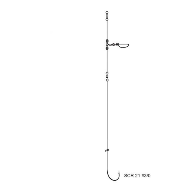 Ideal rig for targeting large fish with big baits over rough ground. The pennel set-up increases hook-up potential and allows large baits, such as squid and crab, to be well presented. The pulley design of the rig means that once a fish is hooked the lead is lifted clear of the seabed reducing the likelihood of snags.