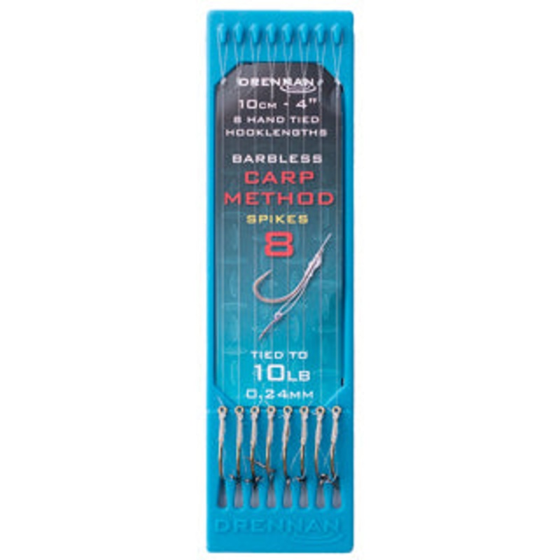 Perfectly tied method feeder rigs using strong and reliable Carp Method hooks tied to 4/10cm of monofilament.The bait spikes are best used with mini boilies and wafter hook baits that are semi-buoyant. The 4 hook plates keep the rigs stored under slight te