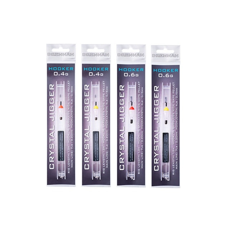 Drennan Crystal Jigger RigsThese hand tied Jigger rigs come in 0.4g & 0.6g with either a hooker or bandit attached making them ideal for baits like pellets, maggots and casters.Each rig is the ideal length for fishing shallow and tied using 7lb 0.20mm rig