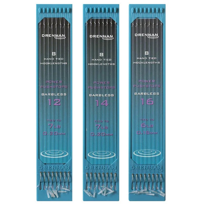 The Barbless Power Hair Rigger hooks used on these Power Pushstop hook lengths have an acute upturned eye this sits the hook dead straight on the hook link providing improved presentation and hooking ratios. The length of the hair on these rigs is matched