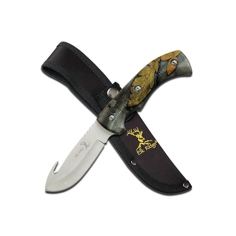 - SPECIAL FEATURES: Fixed Blade Knife, Full Tang Construction, Forest Camo Coated Rubber Handle, Includes Nylon Sheath.