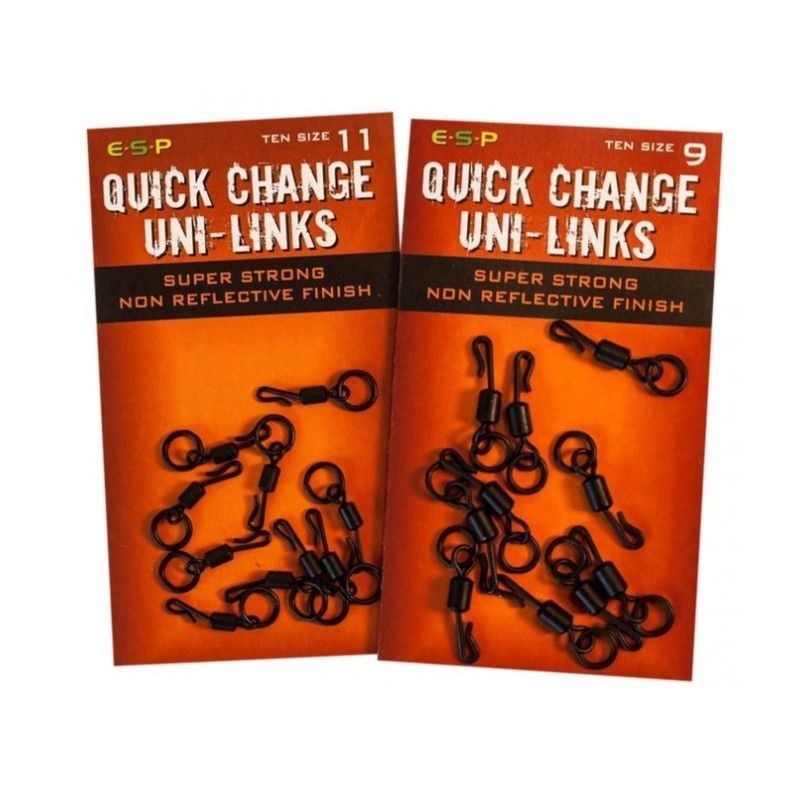 ESP Quick Change Uni-LinksPerfect for the highly effective 'Ronnie Rig', the slight opening in the crook makes it easy to attach the hook and the smooth rotation provides 360-degree movement.PRODUCTThese matt black Quick Change Uni-Links can also be used o