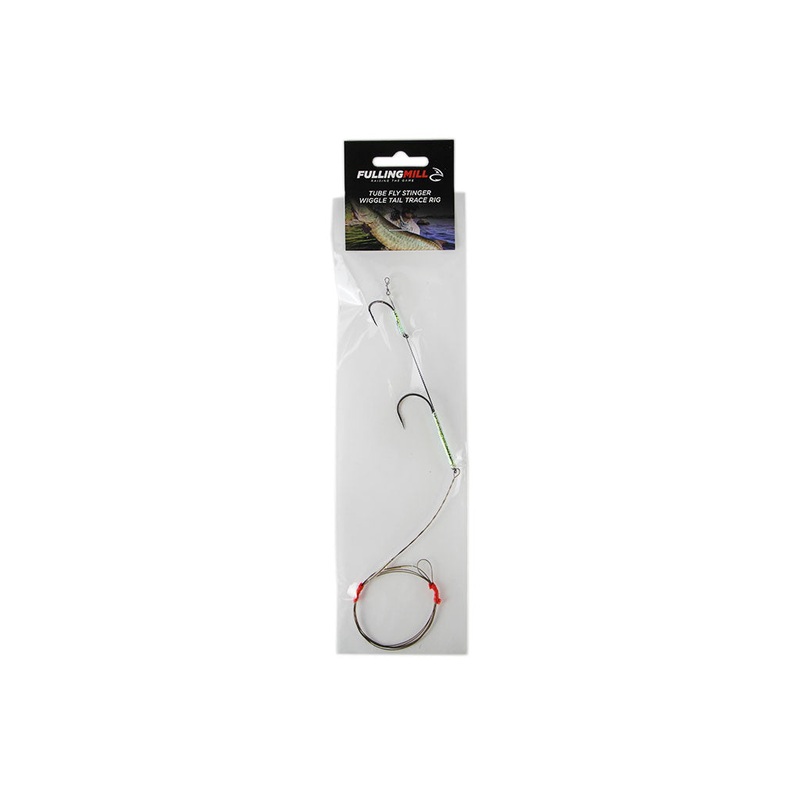 A stinger wiggle tail trace rig, to be used in conjunction withFulling Mill Pike Tube Flies. Slide the loop of the trace through the plastic tube of your fly and seat the eye of the hook in the rear of the tube. The trace is then attached 'Loop to Loop' to