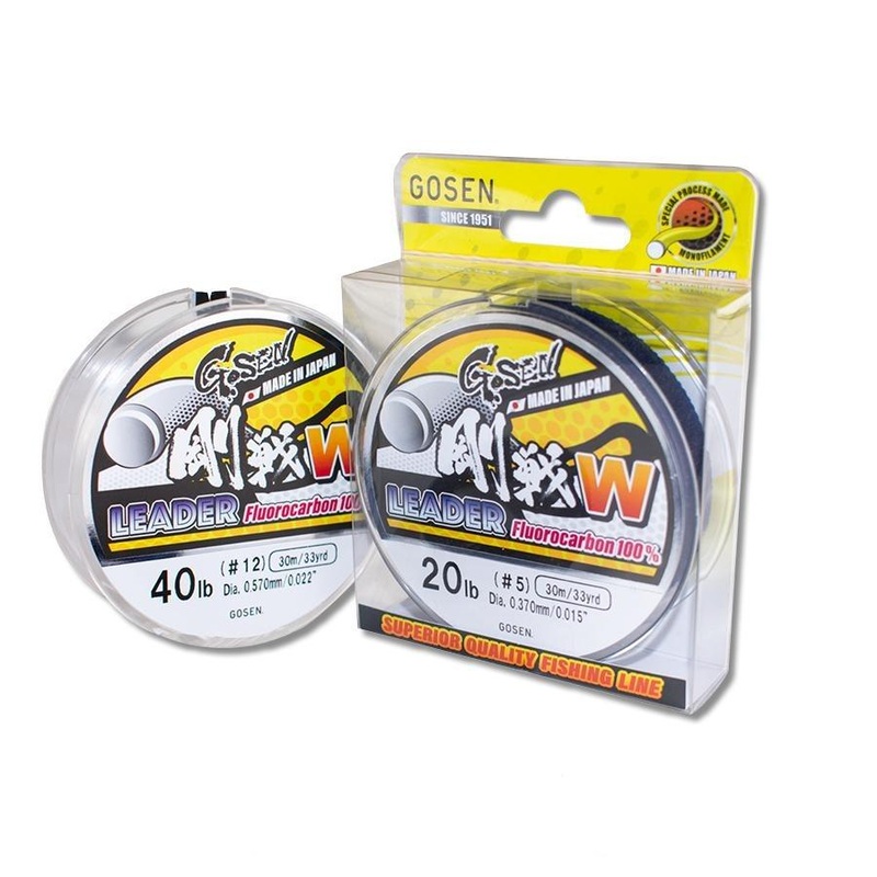 GOSEN W LeaderFC FluorocarbonGosen W 100% Fluorocarbon leader, High-grade high tensile and knot strength Highly abrasion resistant and high transparency. Made in JapanULTIMATE PERFORMANCE 100% FLUOROCARBONLEADER MATERIAL, 30M.