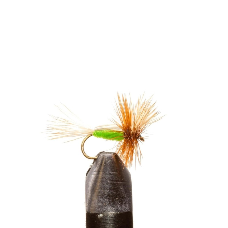 The Green Humpy is a durable and highly buoyant dry fly, excellent for rough water conditions where its visibility and floatation are paramount. Its vibrant green color and robust profile make it an effective attractor pattern, ideal for imitating a wide r