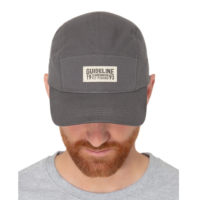 Our Camper is a true 5-panel cap with a streamlined and simple design, crafted from a 5mm cotton rip-stop fabric in a dark grey/charcoal color. On the front panel, you'll find our light sand-colored badge with the Guideline 'Scandinavian Fly Fishing 1993'
