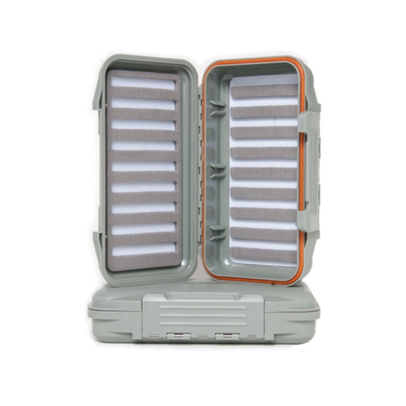 The boxes are very easy to open and has a larger grip on the locking mechanism than on most of this type fly box, easier to grab and open, more solid. The inside depth of the box is generous so it will carry big dries and other types without squeezing them. We offer these boxes in 3 configurations that will cover most of your hook flies, they all measure 196mm long x 106mm wide and 42mm thick. Size fits well into all our vests and packs. Color is slate gray with orange seal and Guideline snakelogo on top.