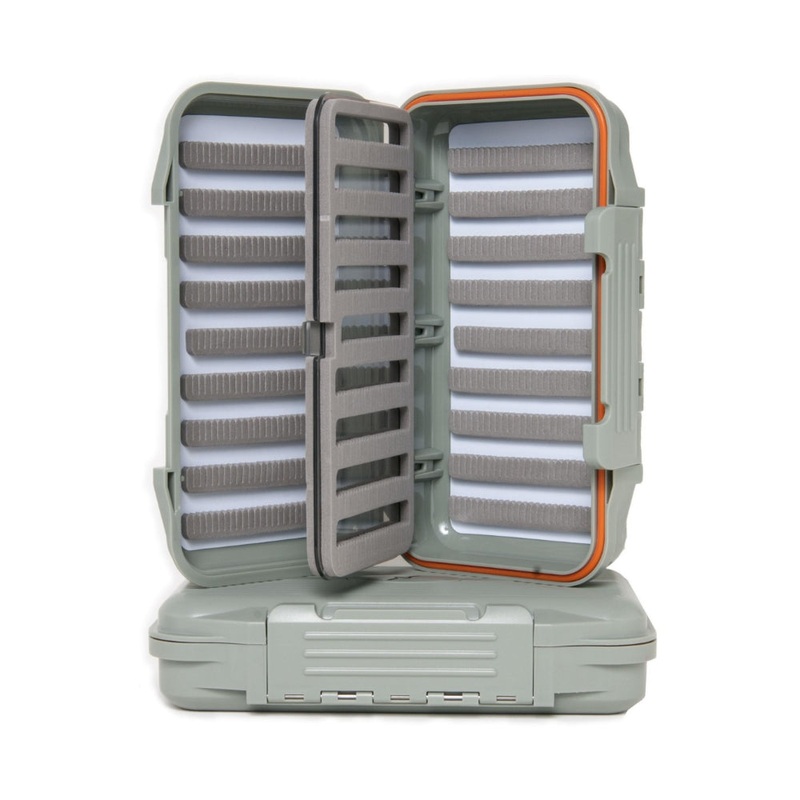 he boxes are very easy to open and has a larger grip on thelocking mechanismthan onmost of this type fly box, easier to grab and open, more solid. The inside depth of the box is generous so it will carry big dries and other types without squeezing them. We offer these boxes in 3 configurations that will cover most of your hook flies, they all measure 196mm long x 106mm wide and 42mm thick. Size fits well into all our vests and packs. Color is slate gray with orange seal and Guideline snakelogo on top.