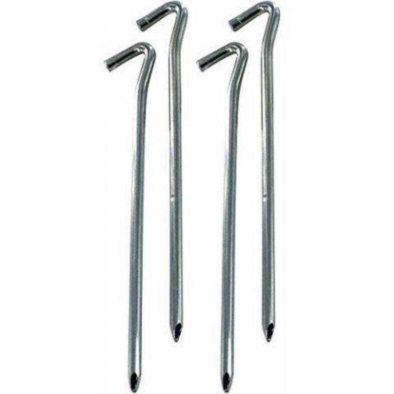 Strong and durable wire pegs with hookGreat for tents or sheltersIdeal addition to any camping kitLength: 9" (22.8cm)Diameter: 0.3" (0.76cm)