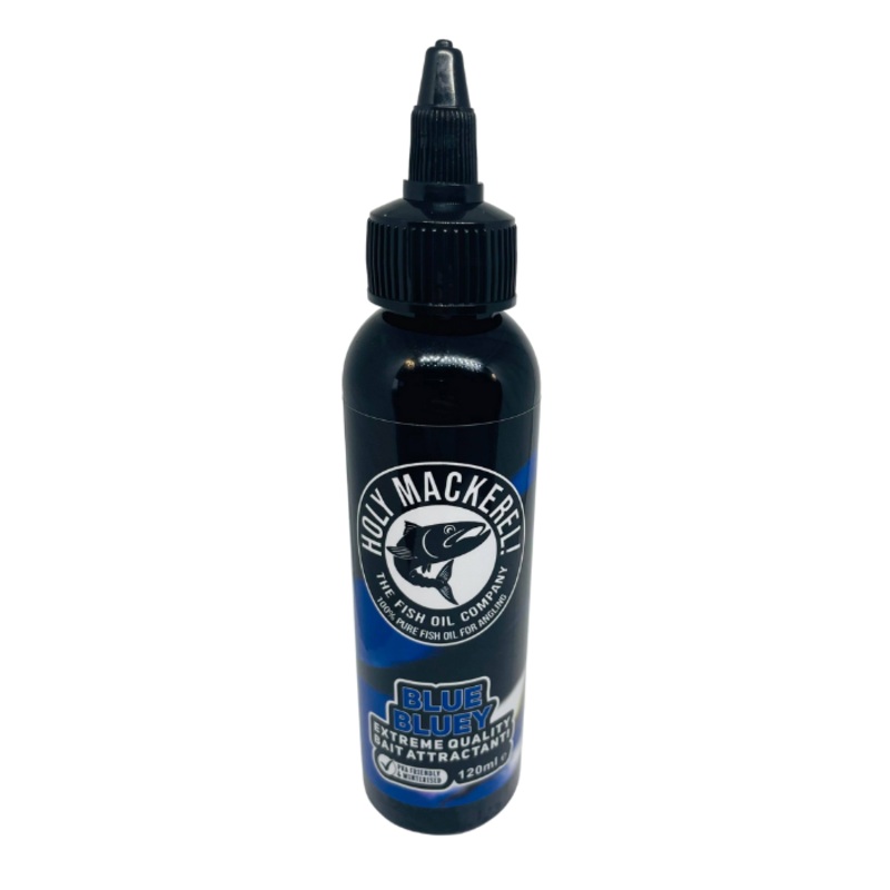 Holy Mackerel Blue Bluey Oil 120mlA top quality one hundred percent pure fish oil with a fish-friendly blue dye added. Effective in both fresh and saltwater for a wide variety of species. Ideal for boosting dead baits by injecting or marinading, and being