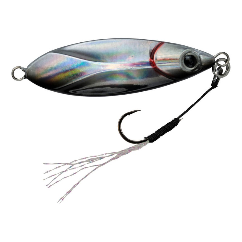 A shore slow jig that when looking down from the top at the lure has a deliberate uneven build and weight distribution. One side of the jig is completely flat while the other side is fatter. The weight has not only been distributed to the one side of the jig, it has a bias towards the back of the lure, too. This two-pronged uneven weight distribution design produces an erratic but slow action that predatory fish find irresistible. It comes in five different, reflective colours and has a UV blast finish too, which makes it react well to light for maximum attraction. An excellent lure for targeting bass, pollack, coalfish, wrasse and other predatory species. It comes fitted with a HTO Shore Assist Jig with lure flash attractor and equipped with quality stainless steel split rings.