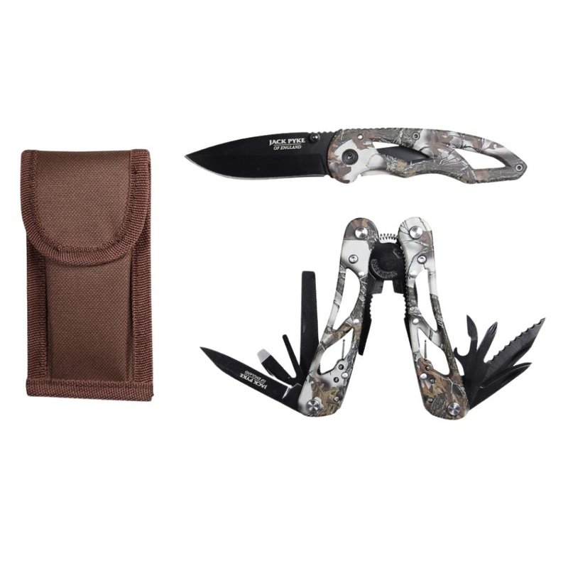 Jack Pyke Camo Multi Tool & Knife Set is the complete multi-tool and knife set for someone wanting to spend time outdoors hunting, fishing, camping, or hiking. The stainless-steel multi-function tool comes with numerous attachments including serrated knife
