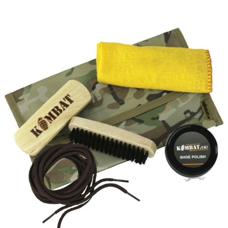 Description: Mesh pocket on back of kit Includes brushes, BROWN polish, Pair of laces and cloth Made from 600D Tac-Poly