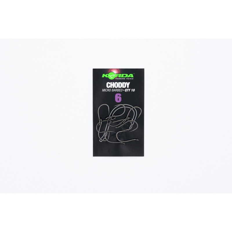 This hook has been specifically designed for use with stiff hook links and rig presentations such as the chod rig or hinged stiff rig, but it can also be used with other pop-up presentations as well. It has an out-turned eye, to help give a continuous curve from the hook link to the hook when using stiff presentations, and the rest of its shape is based upon the iconic Wide Gape pattern, albeit in a slightly thicker wire. It is an incredibly strong hook, as Darrell Peck will attest to, having caught carp to over 70lb on the size 8 version. The slightly curved point is very sharp, and the barb is of a size that doesnt hinder penetration, but once in, helps the hook stay securely in place. The Choddy comes in barbed and barbless versions, in a choice of size 12, 10, 8, 6 or 4, with ten hooks in each pack.