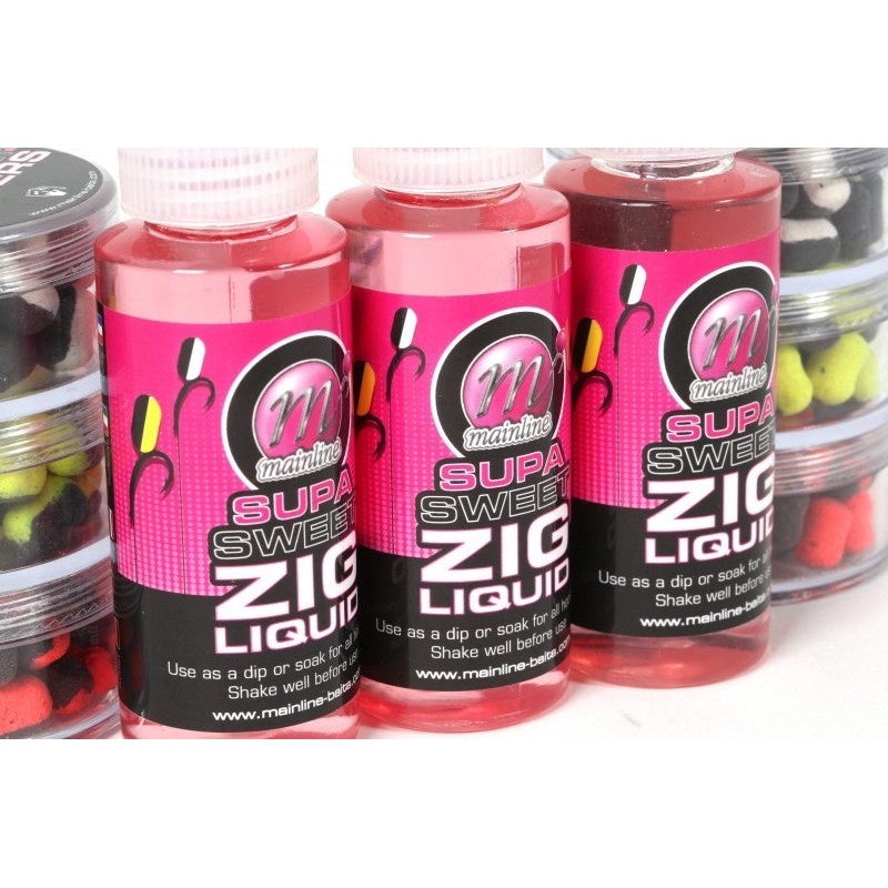 Mainline Supa Sweet Zig Liquid 100mlThe NEW Supa Sweet Zig Liquid has been designed for use as a highly attractive dip and glug for any hookbait, and is ideally suited to the enhancement of Zig Rig hookbaits such as the NEW Supa Sweet Ziggers! This water s