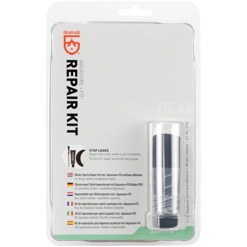 This repair kit is suitable for instant on site or overnight repairs to practically a types of equipment used in water sports, i.e clothing, gloves, dive suits, footwear, boats, kites, spray skirts, luggage etc. Kit includes three adhesive backed repair patches, plus Aquasure urethane adhesive which provides a clear, strong and flexible finish suitable for permanent waterproof repairs on most types of materials.