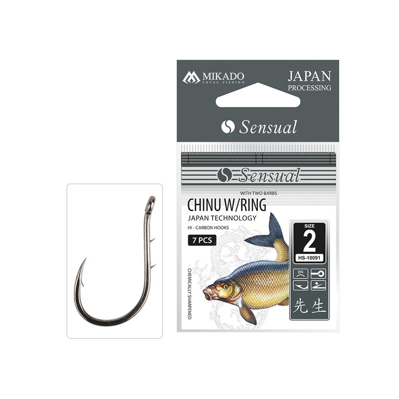The classic, distinctive shape of the Chinu hook, ringed and with additional barbs on the shank. The barbs hold the lure securely so it doesnt slide off the hook.Colour :Black nickelHook point :With barb