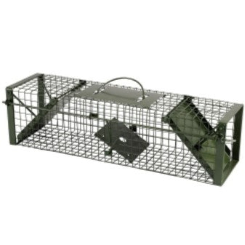 Double entry mink cage trap so target species can enter from either end.Do not confuse this with cheaper copies.Heavy solid doors on each end of mink cage with locking mechanism.Handle on top with hand guard.Can be used with bait or without (when used in a