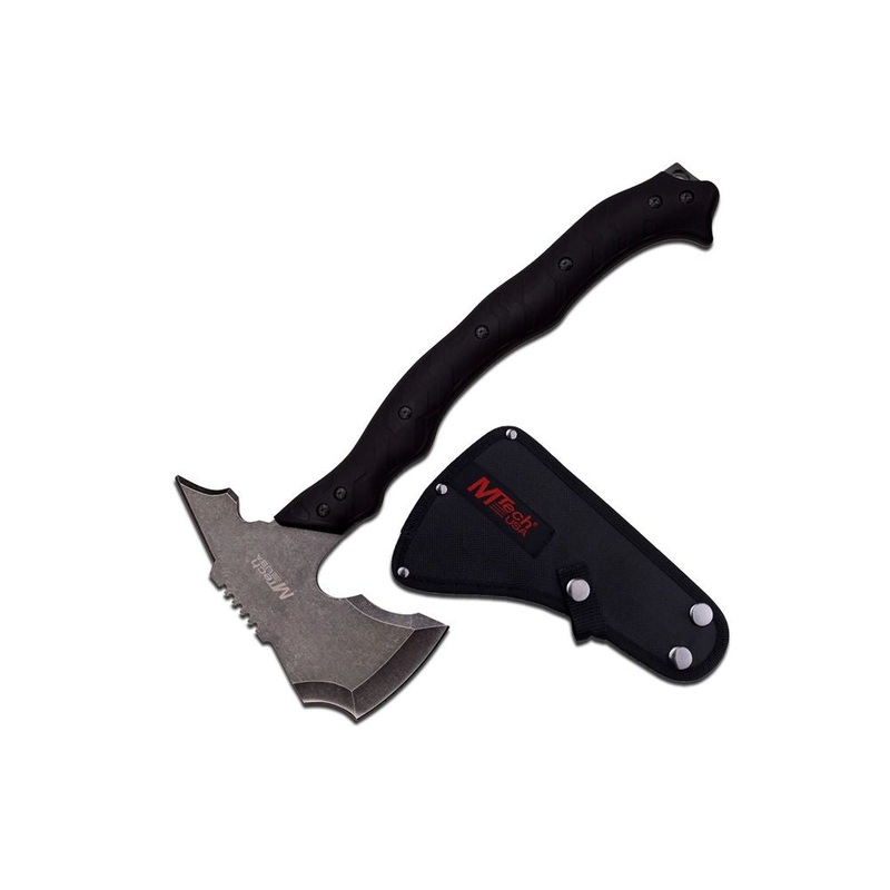 MTech USA Axe14.5" OVERALL3.75" 5MM THICK BLADE, STAINLESS STEELSTONEWASHED BLADEBLACK RUBBERIZED NYLON FIBER HANDLEINCLUDES 1680D NYLON SHEATH