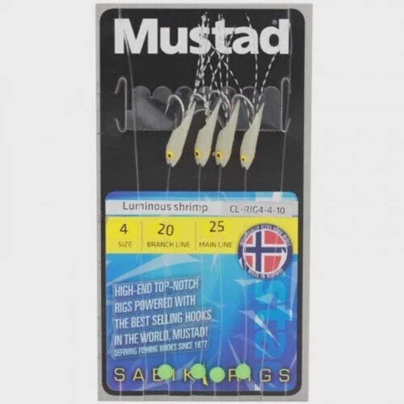 Mustad Sabiki Luminous Shrimp Rig SZ6Mustad Luminous Shrimp Sabiki Rigs have a striking luminescent glow and are highly attractive to mackerel.This trace is fitted with four luminescent shrimp lures and each one includes a feeler tail that gives a great sw