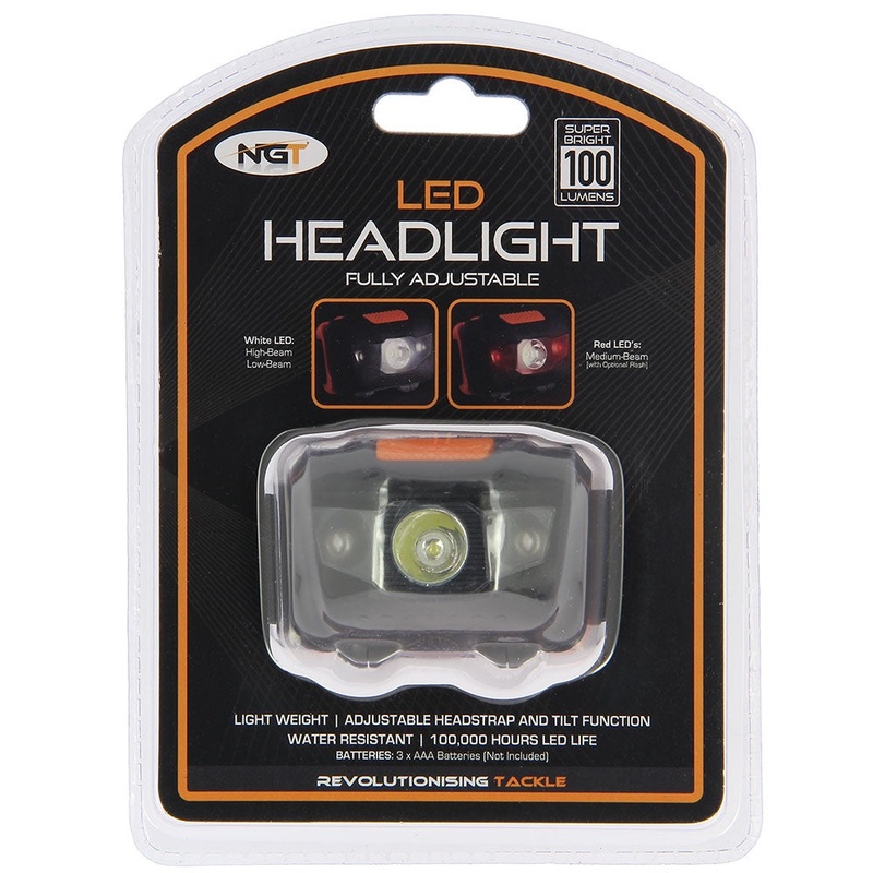 NGT 100 Lumens Headlight100 Lumen white LED light with high / low beam functionTwin red LED light with medium beam and flashing beam functionAdjustable headstrapTilt funtionWater resistantLightweight100,000 Hour battery lifeRequires 3 x AAA batteries (not