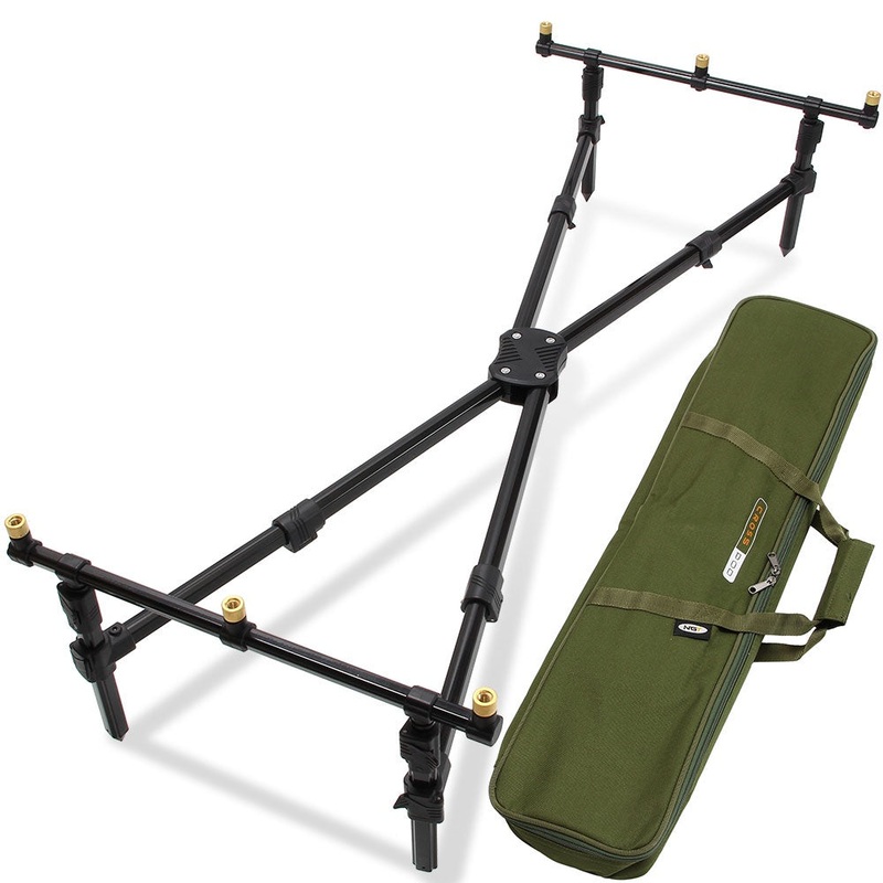 Fully adjustable NGT Cross Pod with deluxe case. Although adjustable, this is designed as a low pod. It can hold up to three rods and comes complete with deluxe case. Features include; aluminum profiled tubes, stable main body, front and rear adjustable 3 rod buzz bars, easy to fold, complete with carry case.
