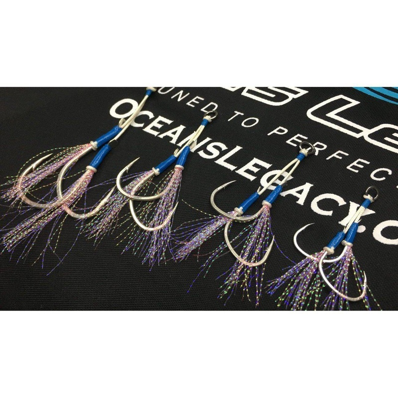 Oceans Legacy Stinger Twin Assist Jigging HooksExpertly crafted with "Fluorocore Cord" and ultra-sharp spade-style slow jigging hooks. The streamlined design minimizes water resistance, optimizing jig action. High-quality, two-toned UV tinsel enhances bite