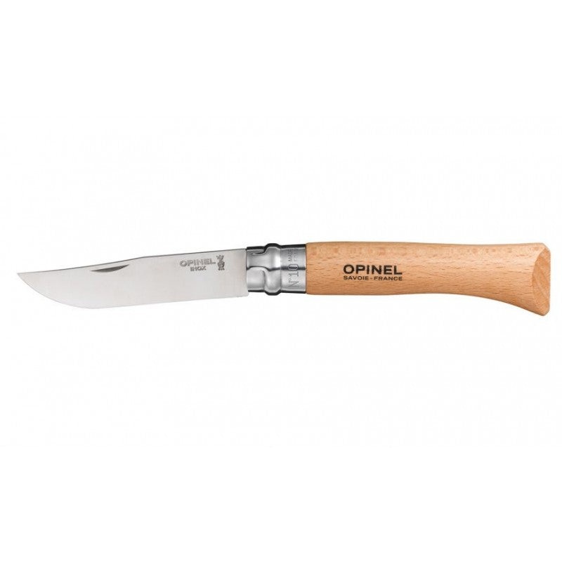 Opinel n10 classic penknife, its 10 cm stainless blade guarantees an excellent cut and offers a great resistance to corrosion. Its varnished beech handle guarantees a safe and pleasant grip. A safety ring allows to lock the blade in open and closed position.