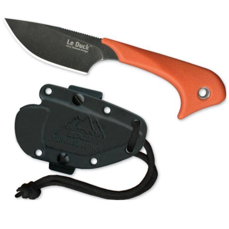 This multi-purpose utility knife is perfect for all outdoor uses and as a lightweight backup blade for any survival situation. The 2.5 Blackstonecoated 8Cr14MoV stainless blade is precisely heat treated and hand finished shaving-sharp for superior edge retention and performance. The distinct duck head handle with TPR coating is extremely comfortable for a secure lock-on grip, even when wet. Features a multi-carry sheath system with a 360 degree rotating clip that attaches to any flotation, fishing, or diving vest, and is compatible with any MOLLE system. The clip is removable and replaceable via two Chicago-style fasteners, and the included 550 Paracord lanyard quickly converts the Le Duck to a neck knife. Available with blaze-orange or black handle. Designed by custom knife maker Jerry Hossom.