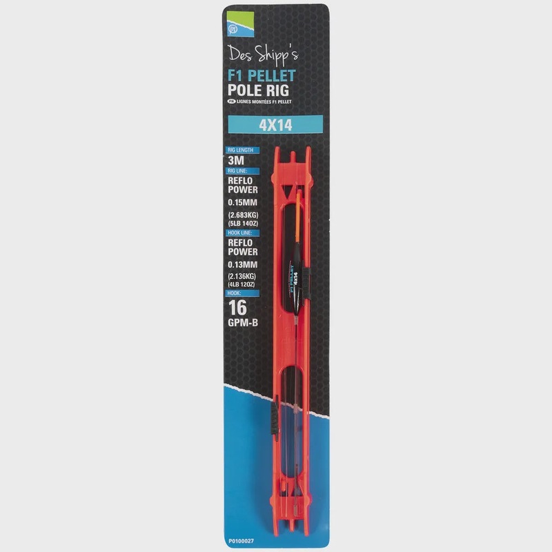 Preston Innovations F1 Pellet Pole RigConstructed from the very finest components and based on rigs tied by our own consultants, the Des Shipp Slims pole float rigs are perfect for use on all commercial fisheries.The floats feature the new Dura side eye wh