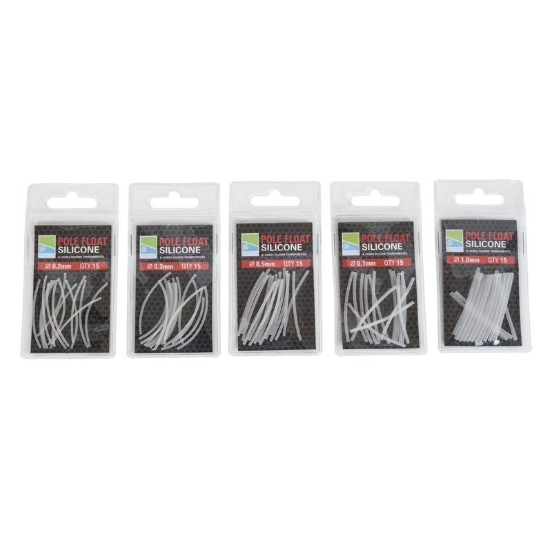 Preston Innovations Pole Float Silicone is a selection of high quality silicone in five popular sizes specifically designed for attaching pole floats when making rigs. Robust and easy to use with a strong 0.5mm wall diameter pre-cut in 40mm lengths. Ideal